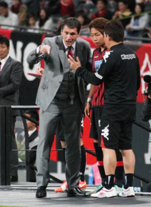 上写真/後半20分、石井に代えて投入するMF中原(中央)に入念に指示を与える札幌のバルバリッチ監督