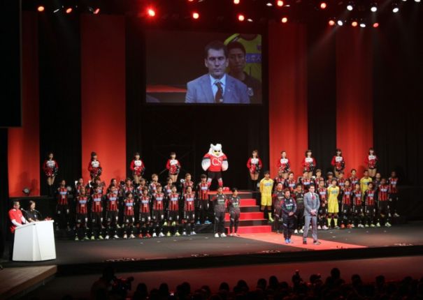 上写真/『2015 Consadole Preview Party』で新ユニホームに身を包み勢ぞろいした選手、スタッフを代表してあいさつするコンサドーレ札幌のバルバリッチ監督(写真はいずれも1月25日、札幌・ニトリ文化ホール、撮影・石井一弘)