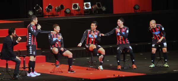 上写真/元コンサドーレ札幌の大森健作さん(左端)の司会で始まった小野、荒野、都倉、河合(右から)。各選手とのトークショーに新加入の稲本(左から二人目)が“乱入”する趣向に場内は盛り上がった