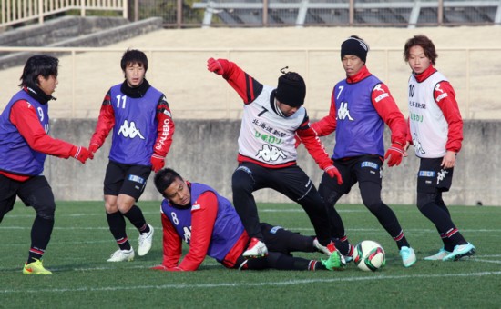 上写真/練習でFW前田(中央ビブス7番)に厳しくタックルする川崎フロンターレから移籍の元日本代表MF稲本(8番)、左からDF前貴之(9番)、MF堀米(11番)、MF前寛之(7番)、中原(10番)。2月19日、熊本県大津町運動公園、撮影・石井一弘