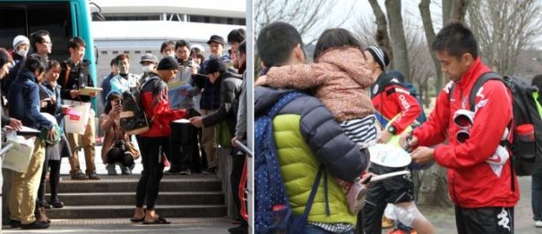 上:右側写真/練習を終え待ち構えていたファンにサインする札幌MF稲本。2月21日、熊本県大津町運動公園