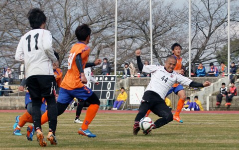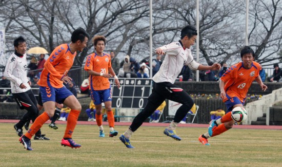 上写真/V・ファーレン長崎との練習試合で、稲本とともに川崎フロンターレから移籍してきたDF福森が前半43分、左サイドからFW都倉の同点ゴールを呼ぶ絶妙のクロスを上げる。福森は20日のFC町田ゼルビアとの試合でも1本目の左DFで先発しており、首脳陣の期待がうかがわれる。2月22日、島原市営陸上競技場