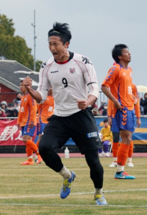 上写真/同点ゴールを決めガッツポーズの札幌FW都倉(9番)。今季このポーズが多く見られればJ1昇格も近くなる。右は天を仰ぐ長崎DF武内(19番)。2月22日、島原市営陸上競技場