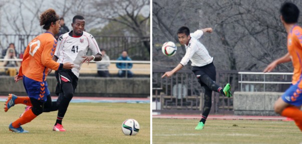 上:左側写真/長崎との練習試合で先発出場した東京ヴェルディから移籍した札幌MFニウド(41番)、スピードとボールを奪取する力で活躍が期待されている。左は長崎MF花井(10番)