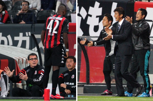 上:下段写真/後半12分、今季から福岡の指揮をとる井原正巳監督(中央)がFW坂田の同点ゴールに拍手を送る