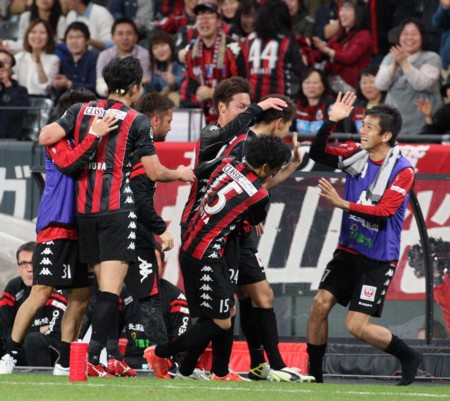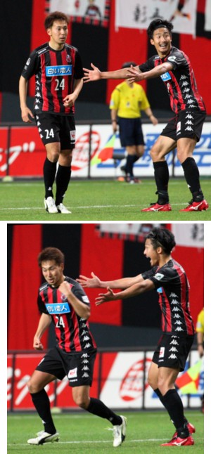 上:下段写真/ボールがゴールに入ったのを見届けて札幌MF福森(24番)がガッツポーズ。これが決勝点となり、福森の移籍後初ゴールとなった