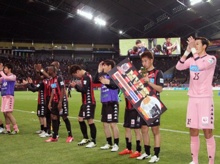 上写真/福岡を2−1で破り今季ホーム初勝利を飾りあいさつする札幌の選手たち。決勝ゴールを決めたMF福森(右から2人目)がこの日のMVP賞を受けた。右端GKク・ソンユンは韓国のU−22代表に選ばれ、しばらくチームから離れる