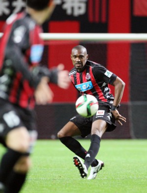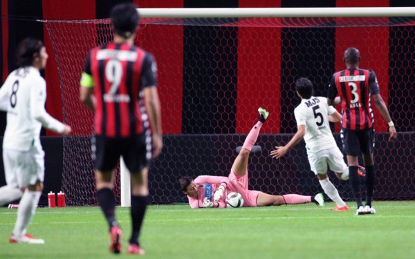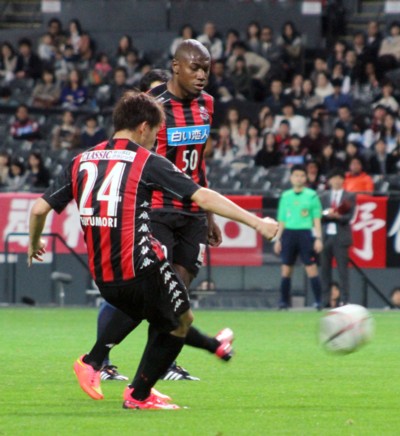 上写真/後半20分、FW都倉が倒されて得たFKをMF福森(左)が蹴ったが、右ゴールポストをかすめるように惜しくもはずす。FWナザリトも蹴る構えのフェイントをしていた
