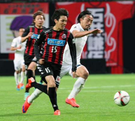 上写真/後半追加タイム3分、右サイドを駆け上がる札幌MF古田(15番)、このところずっと先発し存在感を示している。後半25分にはFWナザリトの同点ゴールの起点となった