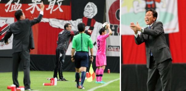 上:左側写真/後半43分、水戸DF田中(3番)のスローインの時、それぞれの選手の位置を懸命に指示する水戸の柱谷哲二監督(左)と札幌のバルバリッチ監督(奥)