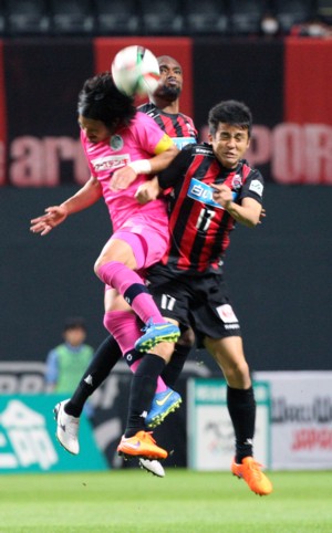 上写真/前半41分、先制ゴールを決めたFW都倉(9番)が「俺のゴールだ!」と言わんばかりのアピール、左はMF荒野(27番)