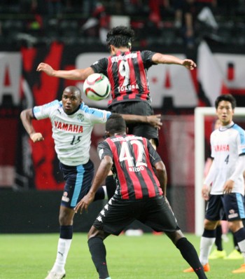 上写真/前半26分、磐田のエース、MFアダイウトン(15番)へのGKからのロングパスに体を張って競う札幌FW都倉(9番)とニウド(42番)