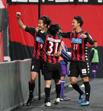 上写真/後半26分、2点目を決めてスタンドのサポーターに拳を振り上げてアピールする札幌FW都倉(9番)に駆け寄って祝福するMF堀米(31番)と荒野(27番)