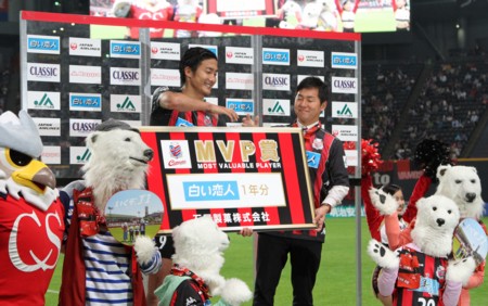 上写真/2得点を決めこの試合のMVP賞を獲得し、石屋製菓の石水創社長(右)から白い恋人1年分を贈られる札幌のFW都倉(9番)