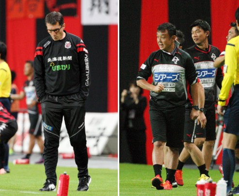 上:左側写真/後半15分、FWナザリトをMF古田に交代させることを決断した後、「さて、どうする?」とばかり、うつむいて考え込む札幌のバルバリッチ監督