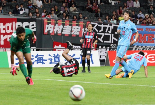 試合はキックオフの後、両軍ボールが落ち着いていない印象の中、いきなり熊本が先制する。前半2分、熊本左サイドの縦パスに抜け出した熊本FW齊藤がペナルティーエリアに侵入。追いすがる札幌DF福森を鮮やかにかわし、GKク・ソンユンの股下を射抜きゴール。