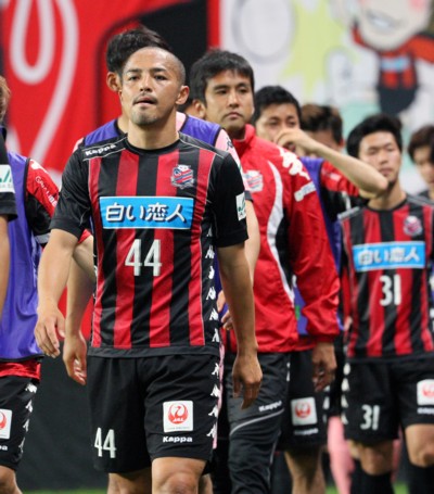 後半追加タイム3分、押せ押せムードの札幌は小野(右)からのパスを受けたMF前寛之(38番)がドリブルで突進する(写真1)。前寛は公式戦で小野と同じピッチに立ててうれしかっただろうな、と私は想像する。小野や稲本らベテランと若手の融合が、今季札幌が上位をキープしている要因の一つだ。