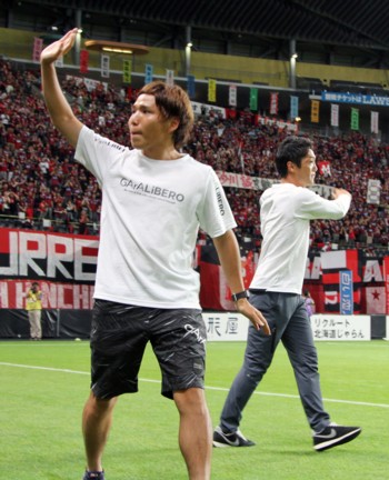 上写真/7月18日の試合前、移籍のあいさつをしたFW榊(左)とMF砂川が、場内を一周してサポ―ターに別れを告げた