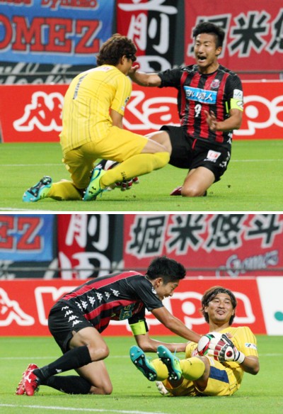 上:上段写真/前半39分、札幌MF荒野の右からのクロスに走り込んだFW都倉(9番)より一瞬早く讃岐GK清水(1番)がキャッチ、勢い余って両者が衝突