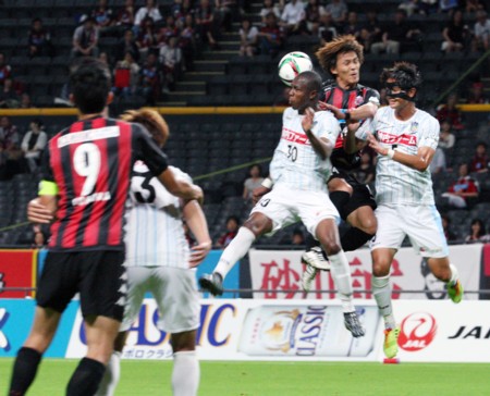 上写真/後半追加タイム1分、札幌DFパウロンの右からのクロスに後半から出場のDF上原がヘッドで合わせようとするが、讃岐DFエプソン(30番)、高橋(右端)にクリアされる