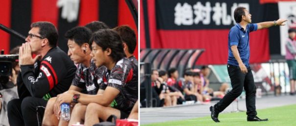 上:左側写真/前半40分、「どうもうまくいかないなあー」と思案顔の札幌バルバリッチ監督とコーチ陣