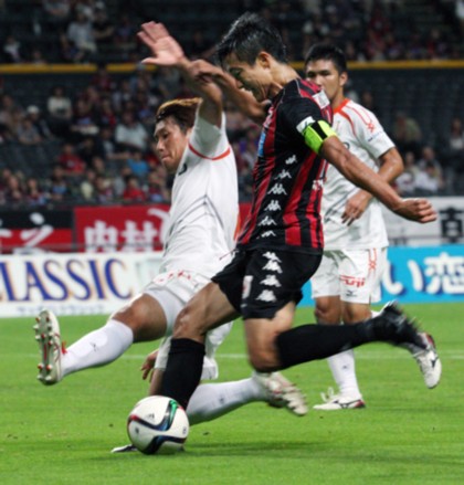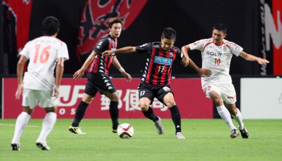 上写真/前半42分、札幌のゴールキックとなって、ピッチ中央に戻りながら、何やら同じように人差し指をかざしながら話し合うMF稲本(17番)とFW都倉(9番)、右はDF福森(24番)