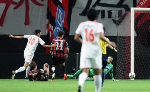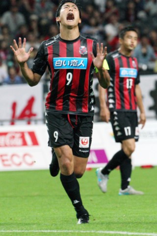 上写真/後半23分、札幌FW都倉(9番)はシュートをGKにクリアされ、大声を上げて天を仰ぐ。右奥でMF稲本もため息が出るような表情をしている