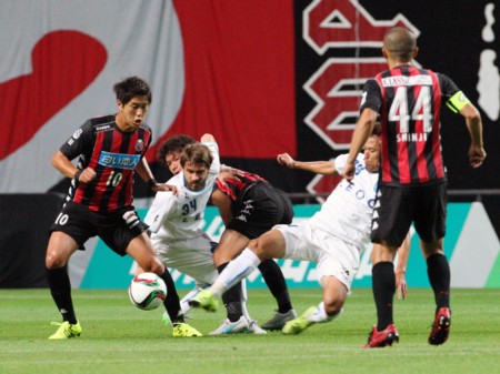 上写真/前半31分、札幌MF上原からのパスを小野が胸でワントラップ、その後正面を向きながらを後方のFW内村(13番)へヒールパスを出した。サポーターから感嘆の声が上がった瞬間
