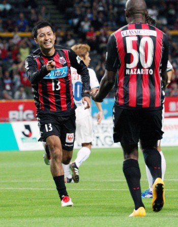 上写真/後半4分、コンサドーレ札幌のFW内村(13番)が2点目の貴重な追加点を決め、満面の笑みでアシストしたFWナザリト(50番)のところへ走り寄る