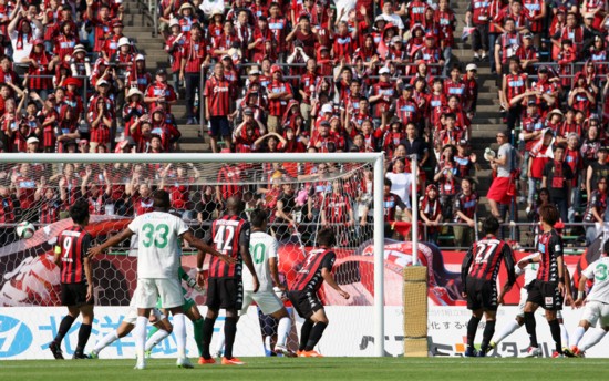 上写真/前半35分、岐阜の右CKからDF渡邊(右端体が半分)がヘッドでシュート、ボールがゴールネットに突き刺さり先制する。屈辱の一瞬にコンサドーレ札幌のサポーターからタメ息が聞こえてきそうだ。札幌の選手は左からFW都倉(9番)GKク(33番の後方)、MFニウド(42番)、DF櫛引(5番)、FW荒野(27番)、MF上原