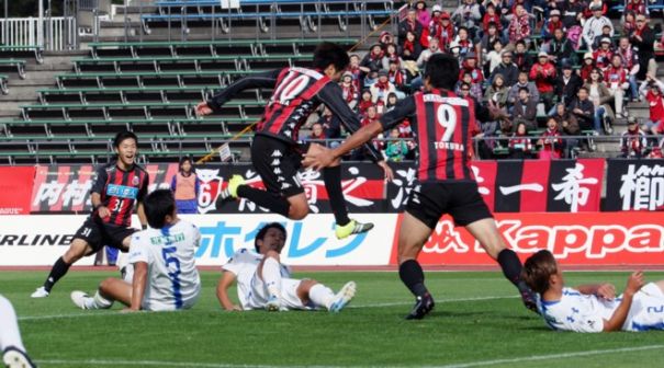 札幌リードで入った後半、一転金沢が逆襲に出る。後半10分、金沢のFKからクロスボールが上がり、金沢FWジャーンに頭で決められた。札幌は同点とされ意気消沈するかと思われたが、この日は違った。