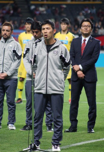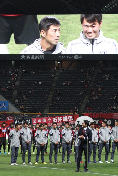 上写真/最終戦後のセレモニーであいさつする札幌の四方田修平監督(中央)、北海道フットボールクラブの野々村芳和社長(右)
