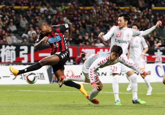 逆もあった。川崎フロンターレからMF稲本と一緒に移籍してきたDF福森(24番)である。4月号の「カメラマンの目、ごめんね!福森君」でも書いたが、当初、稲本と一緒に来た選手ぐらいにしか思わなかった。ところが、シーズンを終えてみるとチームの年間出場時間ランキング1位である。試合数は2位のMF宮澤と一緒で39試合だが、3487分で宮澤より30分多い。これは“ビックリ・ポン!”である。福森を象徴するのが第3節、福岡戦でのセンターサークル付近からのゴールだろう(写真3)。