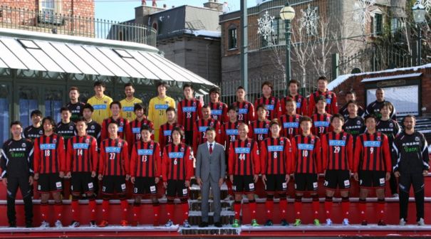 上写真/四方田修平監督を中心に集合写真に納まる選手、スタッフたち。1月16日、宮の沢白い恋人サッカー場、撮影・石井一弘