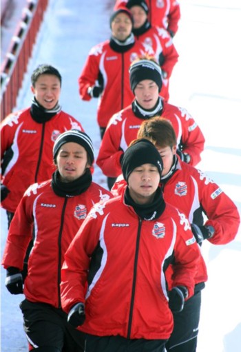 上写真/全体練習初日、新キャプテンとなった宮澤を先頭に走る選手たち。1月14日、宮の沢白い恋人サッカー場、撮影・石井一弘