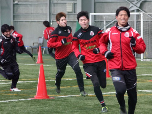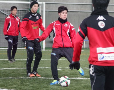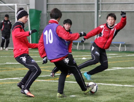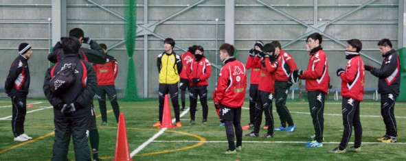 上写真/1月13日、開幕が早まった2016シーズンに向けて、東雁来の札幌サッカーアミューズメントパークで北海道コンサドーレ札幌の若手選手たちが例年よりも少し早めのスタートを切った(この日は24歳以下対象)。若手の練習スタートで訓示する四方田監督(左端)。