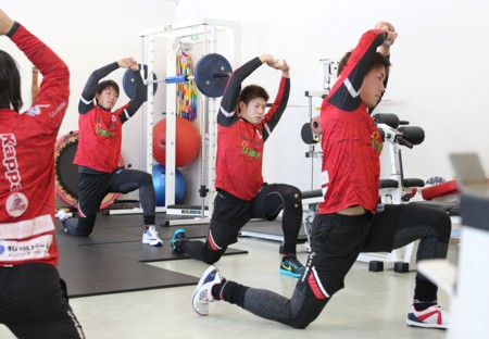 上写真/1月14日、札幌の宮の沢白い恋人サッカー場で、全体練習がスタート。本格的に2016シーズンのチームが始動した。ストレッチする櫛引、深井、永坂(右から)ら。1月14日、宮の沢白い恋人サッカー場、代表撮影・北海道新聞写真部:玉田順一