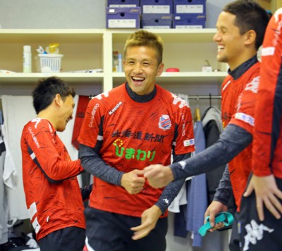 上写真/笑顔の稲本とイルファン。1月14日、宮の沢白い恋人サッカー場、代表撮影・北海道新聞写真部:玉田順一
