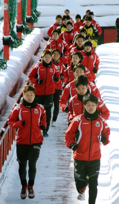 上写真/全体練習の開始で外周だけを除雪したサッカー場を走るコンサドーレ札幌の選手たち。1月14日、宮の沢白い恋人サッカー場、撮影・石井一弘