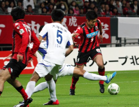 徳島ヴォルティス戦前半7分、ペナルティーエリア内に攻め込んだ北海道コンサドーレ札幌のFW都倉(9番)は、ゴール前を固める徳島DF陣をかわすため、左へ、左へとシュートチャンスを狙ってボールを運ぶ。そのときDF陣の中から足が伸びる。