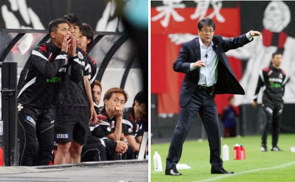 上:右側写真/後半追加タイム4分、千葉の面目にかけて勝利をと、懸命に選手を鼓舞する関塚隆監督、右後方に札幌の四方田修平監督