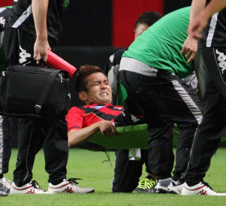 上写真/前半15分、負傷しタンカで退場を余儀なくされた札幌MF稲本は無念さと痛さで顔をゆがめる(後の検査で右ひざ前十字じん帯断裂で全治8か月と診断された)
