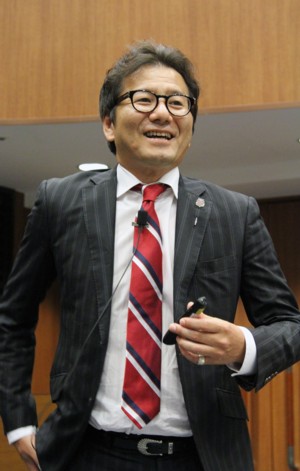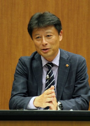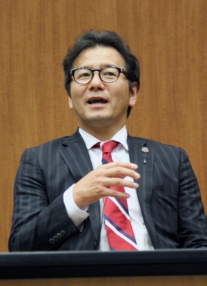 上写真/ポプラ広場「コンサドーレの目指す道」と題し講演する野々村芳和社長