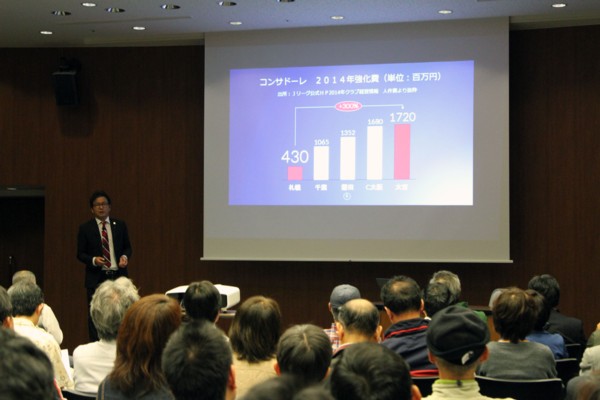 「北海道で20年 コンサドーレの目指す道」と題した北海道コンサドーレ札幌のこれまでと将来を学ぶ集いが5月31日夜、札幌市内のホールで行われた。