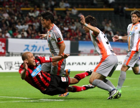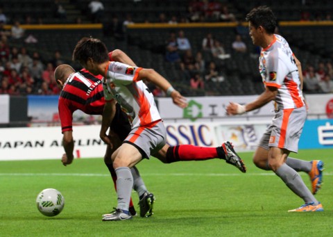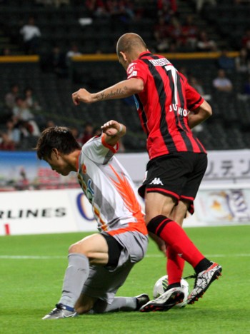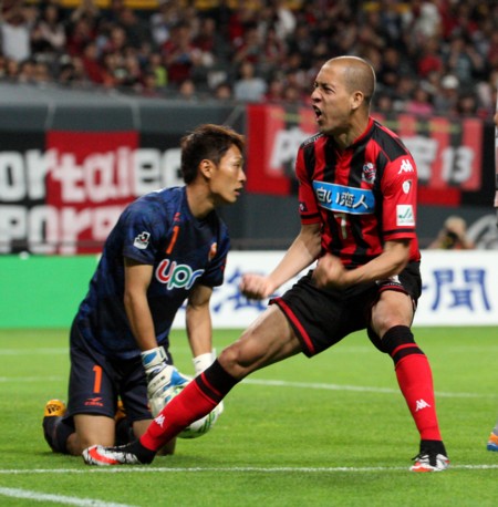 上写真5/PKを得てガッツポーズのジュリーニョ。PKを得てこんなに派手なガッツポーズはあまり見たことがない。山口GK一森(1番)