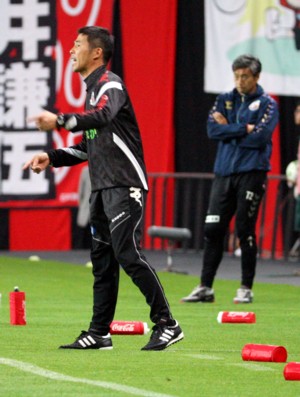 上写真/後半追加タイム2分、懸命に指示を出す札幌の四方田修平監督(左)と腕組みして戦況を見つめる長崎の高木琢也監督