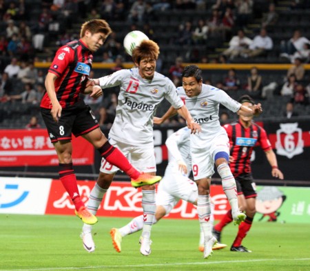 上写真/前半5分、札幌右CKからの攻撃でMF深井(8番)が長崎MFパク・ヒョンジン(13番)、FW永井(9番)とヘディングで競りながらシュートするも決まらず
