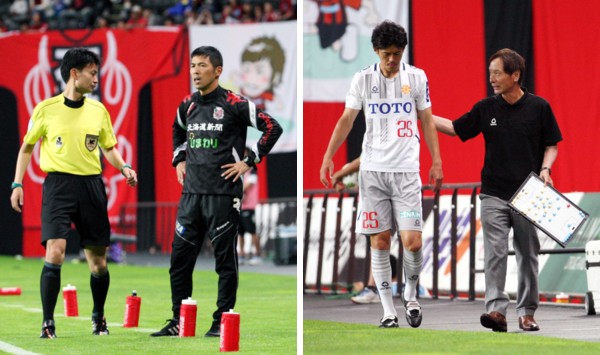 上:左側写真/後半追加タイム5分、札幌四方田修平監督が主審の判定に抗議するが、第4の審判に制止されて憤然とする