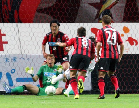 目立った北九州の攻撃は、前半20分、右サイドを駆け上がっていった北九州FW池元が中央へクロス、FW原が頭で合わせるも札幌GKク・ソンユンがキャッチ。続く22分には、札幌MF深井の不用意な横パスをカットしカウンター。左サイドを突破した北九州MF川島のグラウンダーの折り返しから原が左足でヒールキック気味の巧みなシュート。これをGKクがはじき出し、こぼれた球を北九州MF新井がスライディングで押し込む。クは素早い反応で身をひるがえし触ったボールを、今度はカバーに入っていたDF増川がゴールラインぎりぎりのところでクリアー。危ない場面を最後のところでしのいだ。