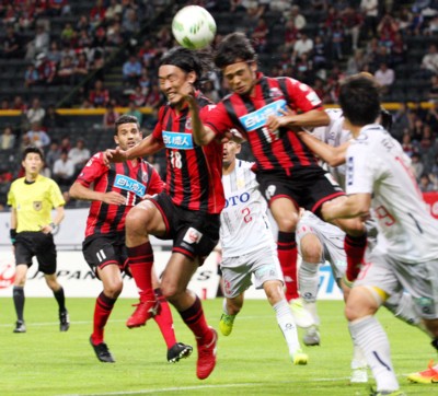 上写真/前半40分、札幌右CKからMF石井(19番)がヘディングシュートするがゴール右にはずす、左にDF増川(18番)、MFヘイス(11番)